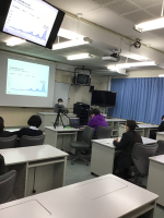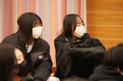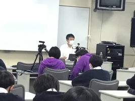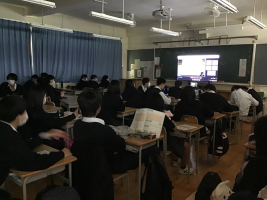 形態 2年A組は視聴覚室で講師の先生に講話をしていただき,他のクラスは、教室でモニター配信による視聴。