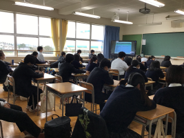 形態 2年A組は視聴覚室で講師の先生に講話をしていただき,他のクラスは、教室でモニター配信による視聴。